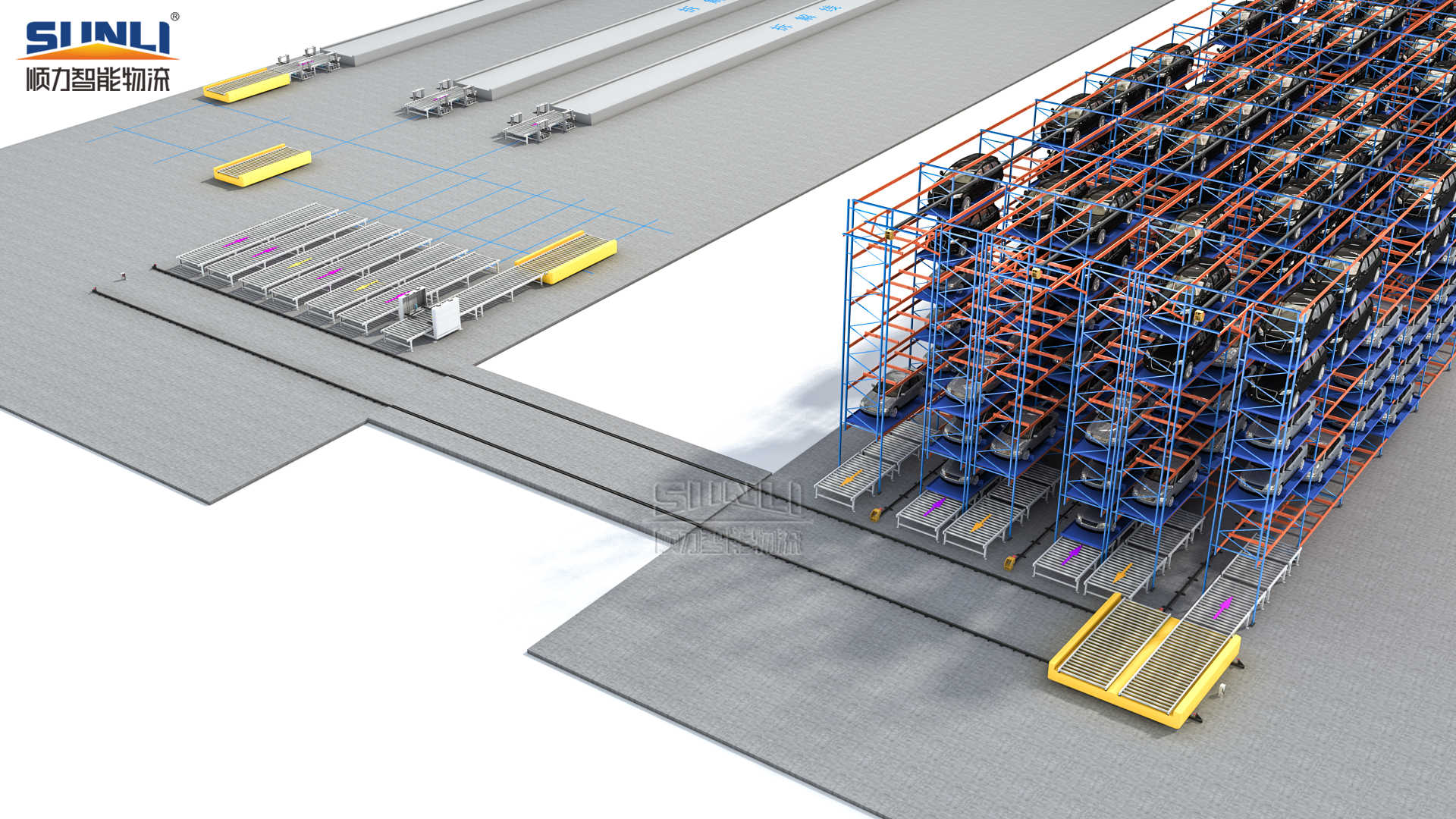 Стеллаж со штабелером одинарной глубины+ с прямыми направляющими | Однонаправленное стеллажное решение + поворотный укладчик | Одинарный стеллаж + вилочный штабелер | |